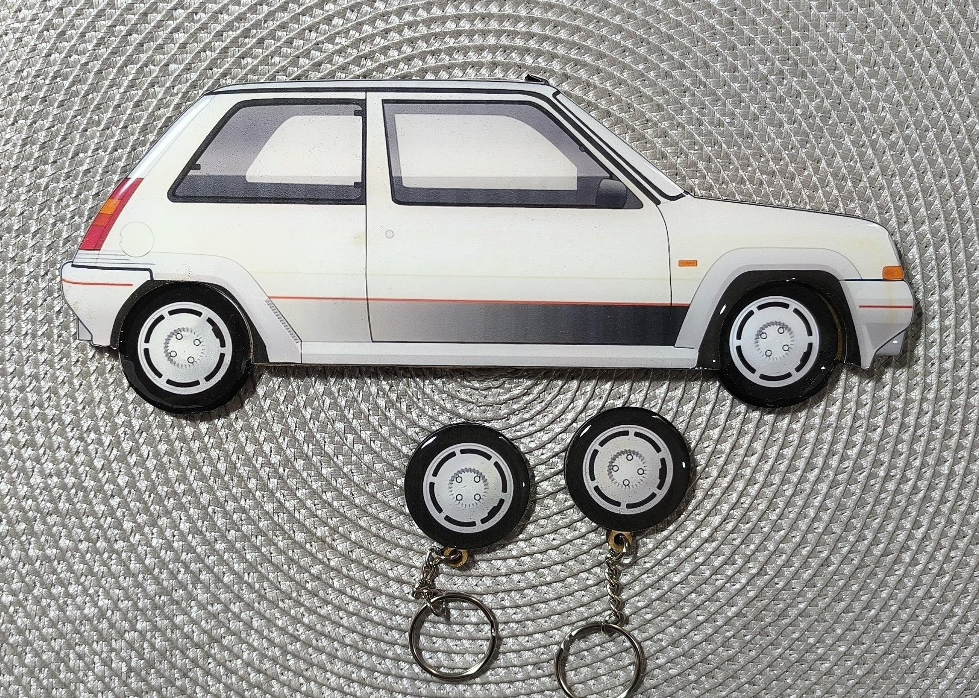 ¡Mantén tus llaves seguras y con estilo con nuestro cuelga llaves Renault 5 Gt Turbo! Con la imagen de este icónico coche y dos llaveros en forma de llantas, ¡nunca volverás a perder tus llaves! Hecho a mano con atención al detalle.